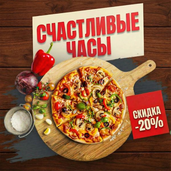 Выбери любые вкусные пиццы в назначенное время, введи промокод «СЧАСТЬЕ» при заказе на сайте и получи скидку 20% на все пиццы в корзине.